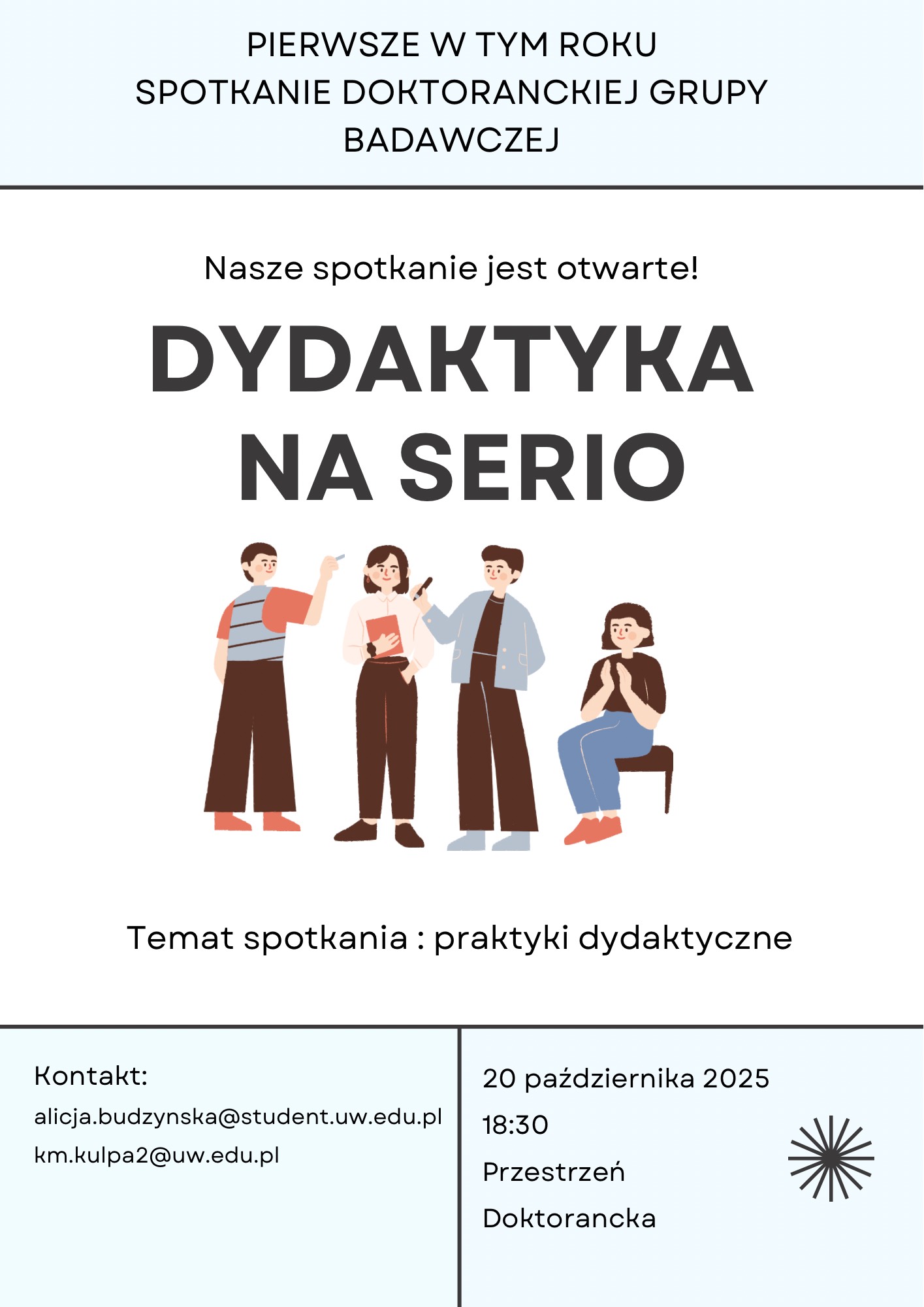 Wracamy do działania! Zapraszamy na pierwsze w tym roku spotkanie doktoranckiej grupy badawczej „Dydaktyka na serio”. Nasze spotkania mają charakter otwarty. Zapraszamy wszystkie osoby zainteresowane refleksją nad dydaktyką uniwersytecką, wymianą doświadczeń i wspólnym poszukiwaniem sensownych rozwiązań.