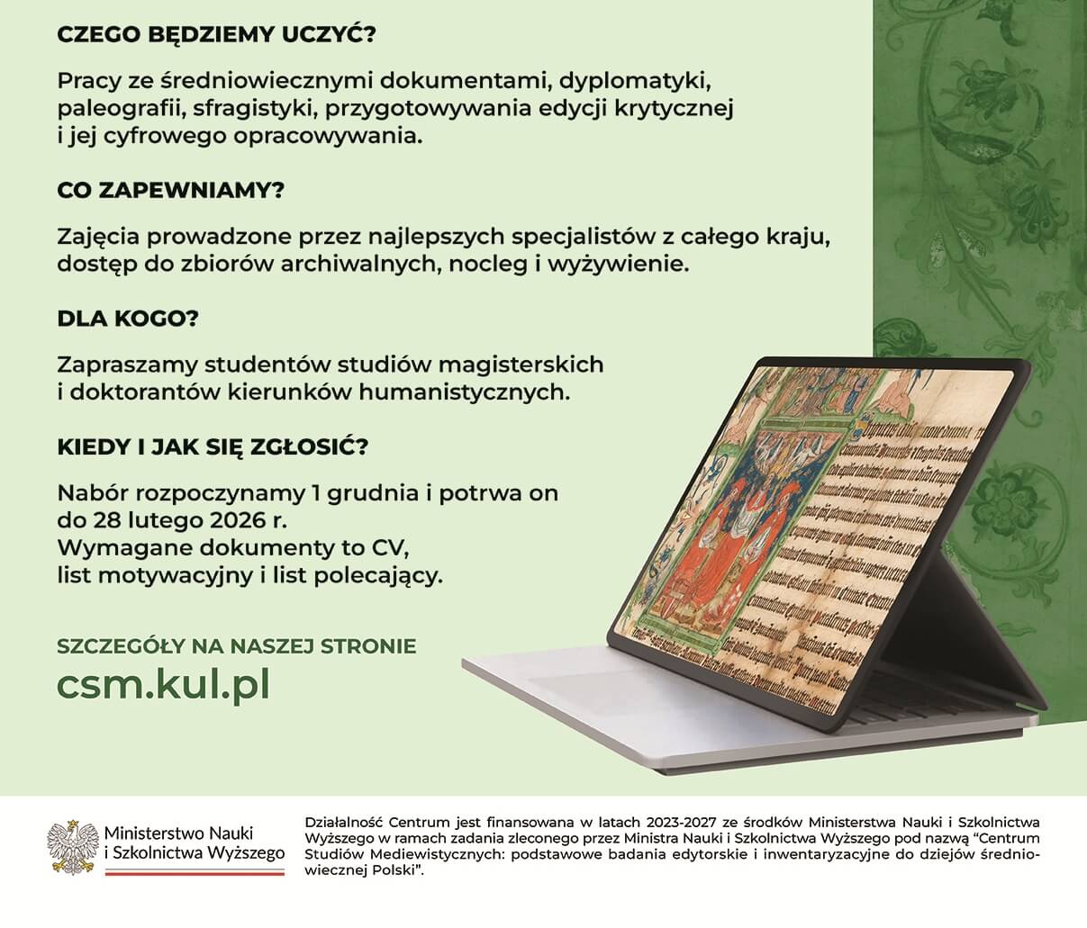 Uprzejmie przypominamy o możliwości zapisów na nadchodzącą Szkołę Letnią Centrum Studiów Mediewistycznych KUL pt. “Od dyplomatyki do piśmienności pragmatycznej”, która odbędzie się w Krakowie w dniach 7-15 września 2026. Nabór jest jeszcze otwarty i trwa do 31 stycznia. Więcej informacji znajdą Państwo na stronie: https://csm.kul.pl/szkola-